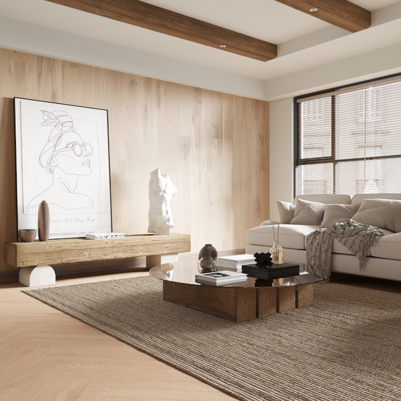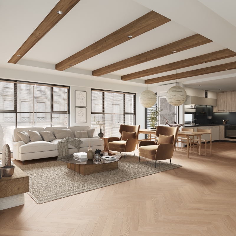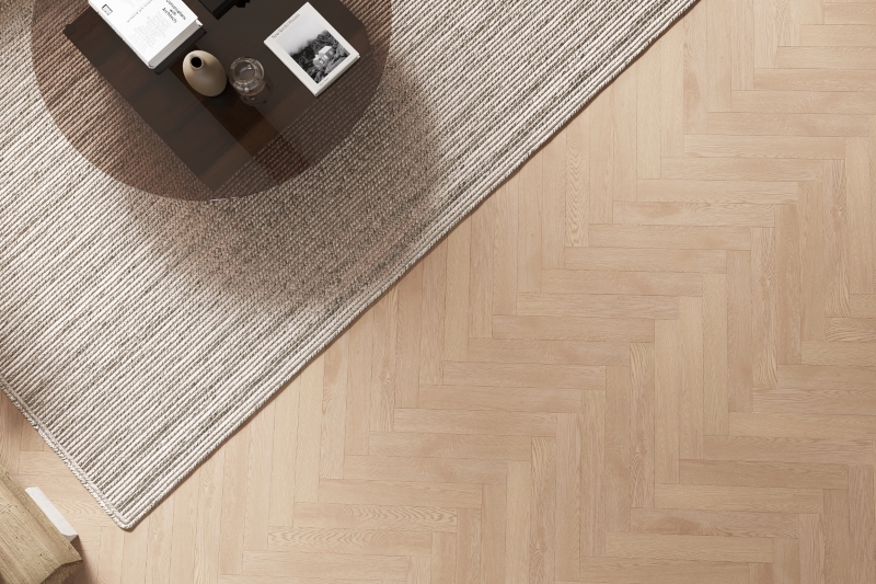 Old Canvas decor from ME Floor Core Range in Herringbone Pattern offers versatility, pairing well with warm, light and beige interiors. It not only complements these tones but also brings a sense of spaciousness and depth to your space, creating an inviting and expansive ambiance. Can be easily installed together with wide board plank flooring in the same color and finish.